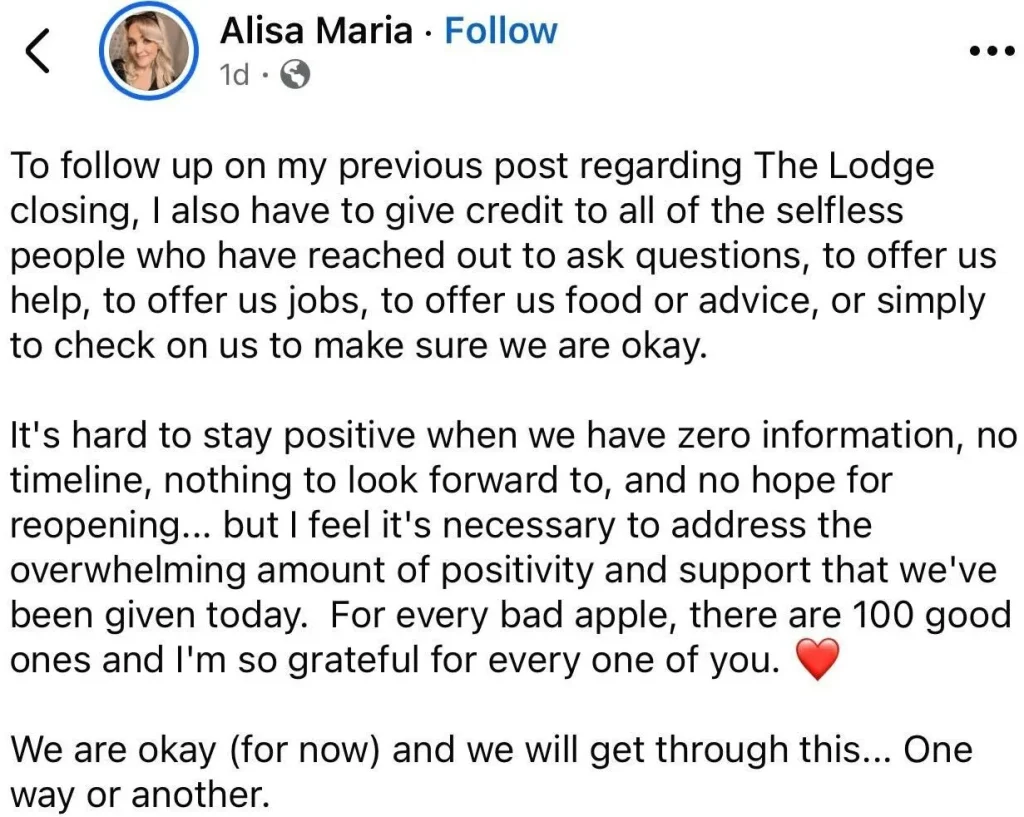 - 調查結束後沒有任何指控,The Lodge 重新開業